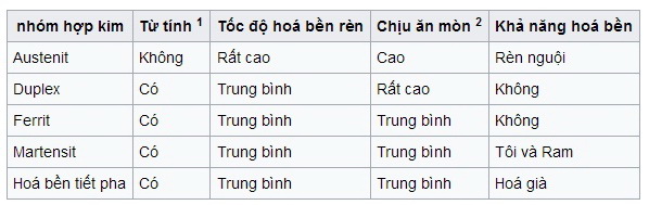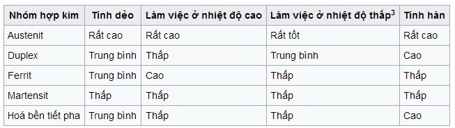 (2)- Biến động đáng kể giữa các mác thép trong mỗi nhóm, ví dụ, các mác không gia được có tính chịu ăn mòn thấp hơn, và khi có Mo cao hơn sẽ có tính kháng cao hơn.